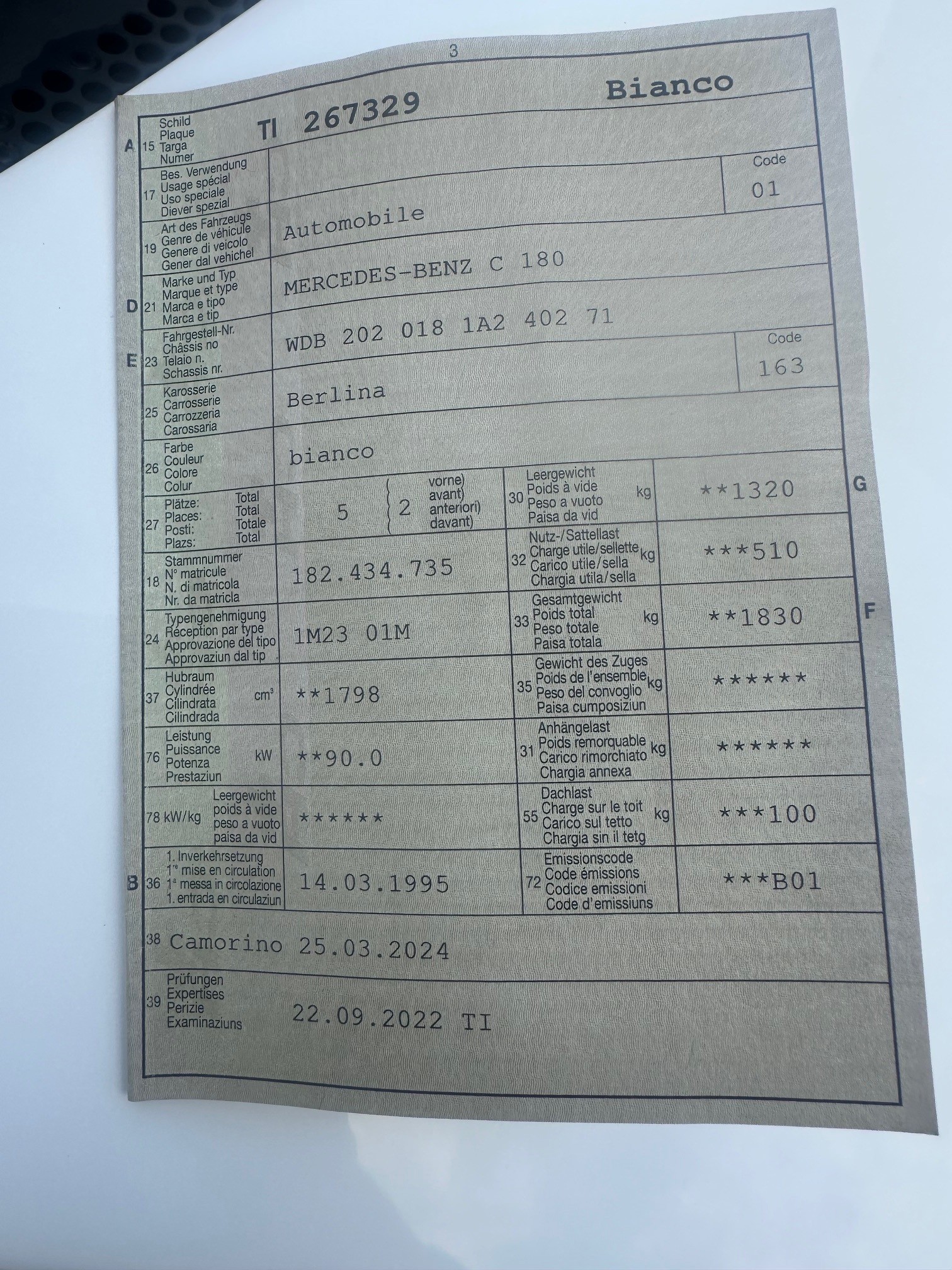 Per conto di un cliente vendiamo una MERCEDES C180Aut anno 1995/04 km 163’500 collaudata il m22.09.2022 (collaudabile Epoca Veteran ) , con vetri elettrici anteriori tetto apribile elettrico, cambio automatico , sensori parcheggio posteriori, ecc.